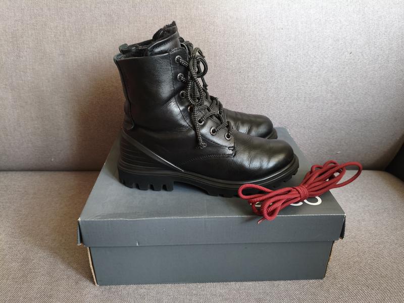Черевики ECCO Tred Tray. Верх - натуральная кожа. Утеплитель - шерсть/шерсть. С боку на молнии. Не промокают. Размер 34, длина стельки около 22,7 (фото). Данная модель большемерит, подойдут и на 35. В хорошем состоянии, носили 1 зиму. Єдиний нюанс - шнурки, повідпадали наконечники, на фото показала. Но есть новые из комплекта.