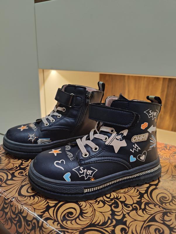 Демисезонные ботинки. Внутри утеплены флисом. Правильной формы, не сжимают пальчики. Стелька кожаная. Есть супинатор. С внутренней стороны застегиваются на молнию. Сверху для фиксации есть липучка. Стелька 19 см. Подошва массивная, что придает обуви стиль и обеспечивает хорошую амортизацию. Выглядят нарядно с любым нарядом. Можно создать непревзойденный образ с голубым костюмом, вышитым розовыми бабочками. Костюм Primark, размер 110-116. Цена 600 грн. Утепленные темно-синие джинсы, размер 116, цена 350 грн. Светлые джинсы, размер 110, цена 250 грн. При покупке всего образа ботинки+костюм, ботинки+джинсы выполним выгодное предложение.