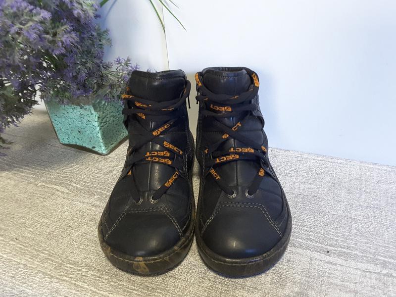 EJECT-португальская компания с 27 летним опытом производства обуви.Прелесть,что за обувь.Успех компании объединяет в себе 3 составляющие: дерзкий,инновационный дизайн,комфорт и качество сырья.Все это и есть обувь с "характером".Разрабатывая уникальные ,удобные формы бренд добивается уникольного комфорта своей обуви с креативным дизайном. Предлагаю оригинальные ботиночки-кроссовки ,которые подойдут,как и девочке,так и мальчику.Ботики выполнены из натуральной кожи,как снаружи,так и внутри.Для удобства обувания есть молния,кроме центральной шнуровки.Подошва цветной полиуретан.Подошва прошита. Размер заявлен 37,полная длина стельки 24 см,ширина 9 см. Внутренняя кожаная подкладка ярко оранжевого цвета.Целая,но возле "язычка" есть потертости краски,без повреждения кожи (фото 10).В цену включено. Кожа ботинок без повреждений и потертостей. Прежде,чем оформлять заказ просьба связаться с продавцом для уточнения деталей. Наложки и безопасной нет.