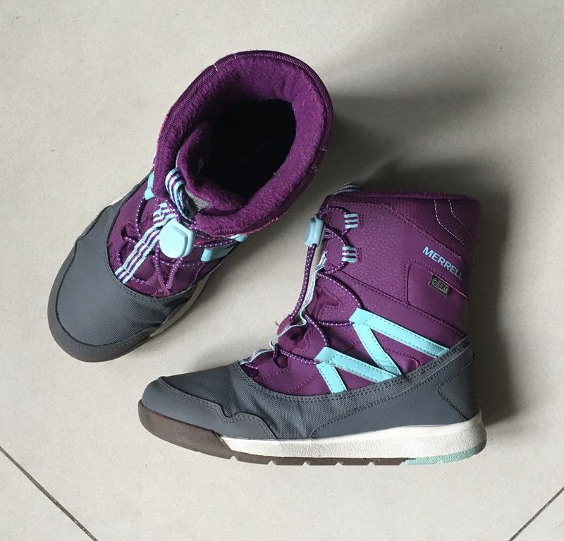 Оригінальні черевики американської фірми MERRELL в ідеальному стані. Модель MERRELL M-SNOW CRUSH WTRPF. Натуральна шкіра. WATERPROOF. INSULATION 200 gram. Шнурок - гумка (не потрібно шнурувати). На температуру до -32. Взували пару разів (дивіться фото підошви та середини). Ціна нових на останньому фото.
