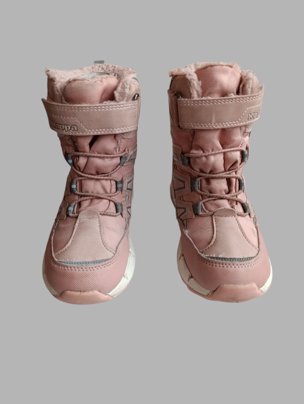 Термо-ботинки для девочки ТМ Kappa Floki Tex в хорошем состоянии. Ботинки не промокают, не скользят. Размер: 31 ( стелька 19,7 см ) Цвет: розовый с серыми или голубыми акцентами; Снизу добавлению описание из интернета. Информация о товаре: Бренд: Kappa, итальянский производитель спортивной одежды и обуви. Модель: Floki Tex K. Назначение: Зимняя обувь для детей. Технология: Обувь оснащена водонепроницаемой мембраной Kappa Tex, которая защищает ноги от холода и влаги, сохраняя их сухими. Материалы: Верх изготовлен из синтетических материалов и искусственной кожи, подкладка – из искусственного меха. Подошва: Выполнена из термопластичной резины, не скользит. Особенности: Имеют высокий верх для поддержки щиколопы, застежки-липучки в сочетании с эластичными шнурками для удобства надевания и съемки, а также светоотражающие элементы.