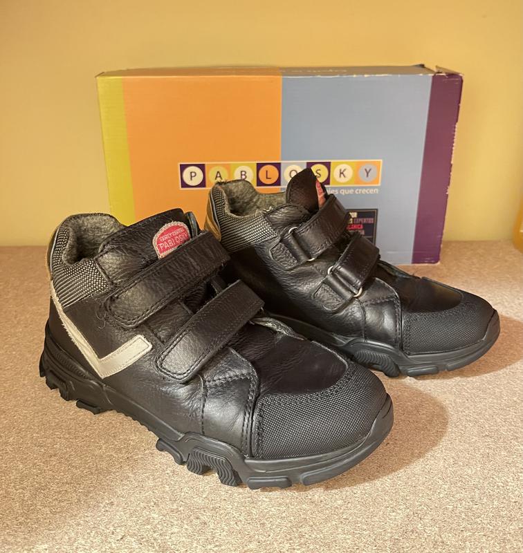 Утеплені черевики. Верх - натуральна шкіра , матеріал утеплювача — мікрофібра, матеріал устілки — мікрофібра, матеріал підошви — термопластична гума, застібка на липучці