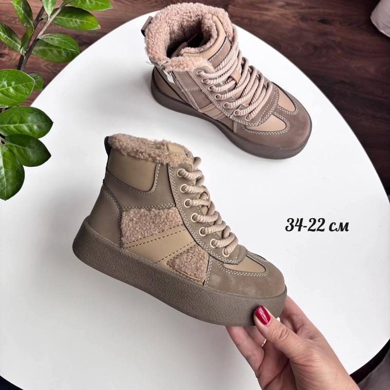 Зимова новинка Качественная эко кожа с комбинацией барашка Внутри теплый мех ( натуральная овчина 60 %) Стелька также утепленная Фиксация шнуровкой., боковая застежка Цена 1380 34-22 см 34-22 см