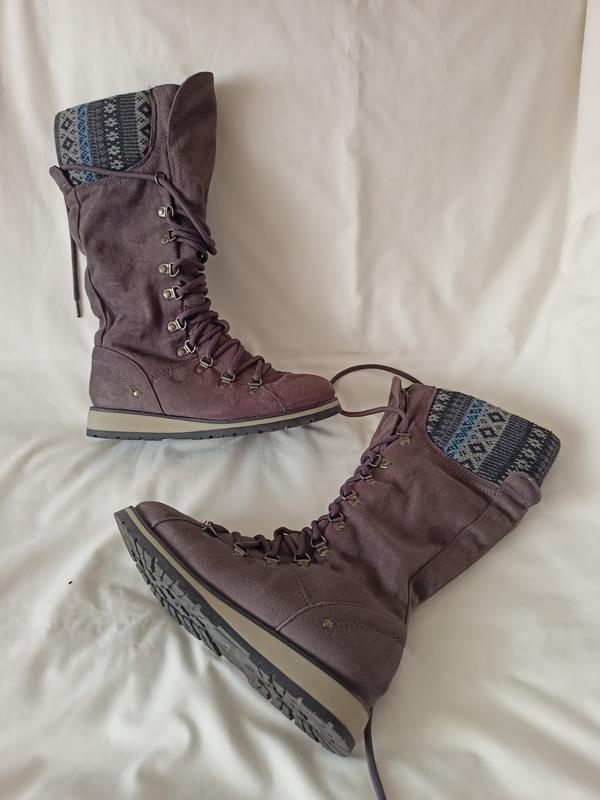 Сапоги демисезон на шнуровке, но для удобства сбоку есть замочки-молнии. в очень хорошем состоянии, но есть нюанс изнутри возле замочка пошевелился материал (последнее фото). при носке этого абсолютно не видно. цвет серый, однородный, на фото так отображается свет. размер указан 38, но лучше подойдут на 37.