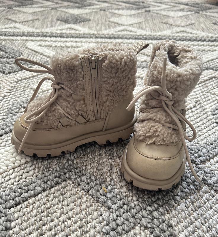 •Стильні та дуже затишні зимові черевики від Zara. Мʼякеньке хутро (шерпа) та зручний фасон - ідеально для маленьких ніжок. • Розмір: 23. • Колір: Бежевий. • Зручність: є блискавка збоку (легко взувати) та шнурівка для фіксації. • Стан: Вживані, в хорошому стані. Підошва ціла, тракторна (не ковзає]. Ціна: 320 грн.