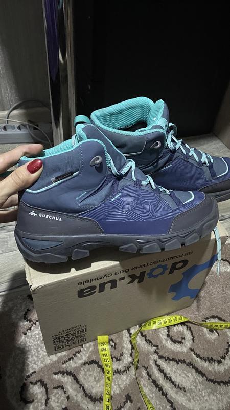 Водонепроникні дитячі трекінгові черевики QUECHUA 37 го розміру (устілка 23,5 -24) у хорошому стані. Особливості: Вони легкі та водонепроникні, забезпечують гарне зчеплення. Водонепроникність водонепроникна мембрана протестована протягом 4 км ходьби у воді до половини верху. Зчеплення підошва з коефіцієнтом 0,66: для безпечного пересування будь-якою місцевістю. Легкість 252гр розмір взуття 37. Амортизація Ексклюзивна система для поглинання ударів у п'яті. Гарантія комфорту.