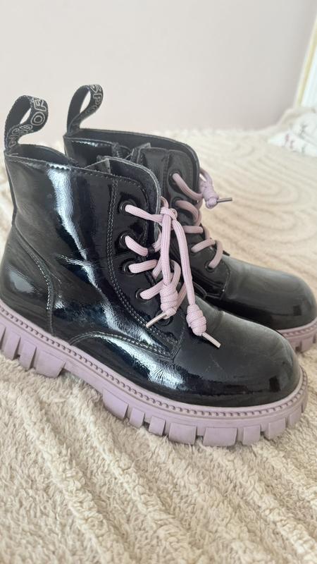 Осінні черевики на дівчинку Стан: ідеальний, носила обережно. Стильні лакові, підошва не ушкоджена. Всередині мікрофліс. Вік: 10-11 років Розмір: 35, але по підошві - 25 см (великомірки)