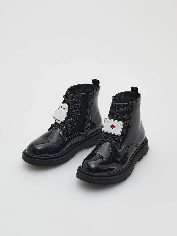 Лаковані чорні черевики на замочках з символікою Гаррі Поттера, яка за бажання знімається. Дуже гарні та зручні. На осінь, на весну, демісезон. На дощову погоду, святкові, у театр. Пропоную до них червоне двобортне пальтечко з леопардовим комірцем. Дивіться інші мої оголошення.