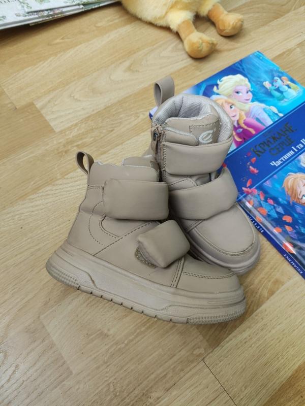 бежевые ботинки clibee на девочку почти не носили переходная, нюанс на фото (в цене учтены) хотя и Деми, но теплые. очень удобные липучки, ребенок одевает сам стелька 17. планомерные, регулируются по подъему липучкой. имеет много одежды и обуви, на вторую единицу -40%