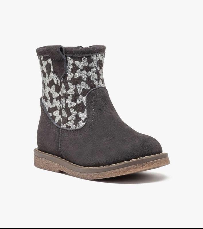 Це дитячі черевики бренду Gemo (зокрема лінійка Baby by Gemo), виготовлені зі замші .Модель прикрашена сріблястим принтом у вигляді метеликів на верхній частині халяви та має застібку-блискавку збоку для зручного взування ✔️Розмір:✅23(довжина устілки 14,5см)довжина по підошві 16см,висота черевичок 11см. Натуральна замша.насичений сірий колір,з сріблястими метеликами.