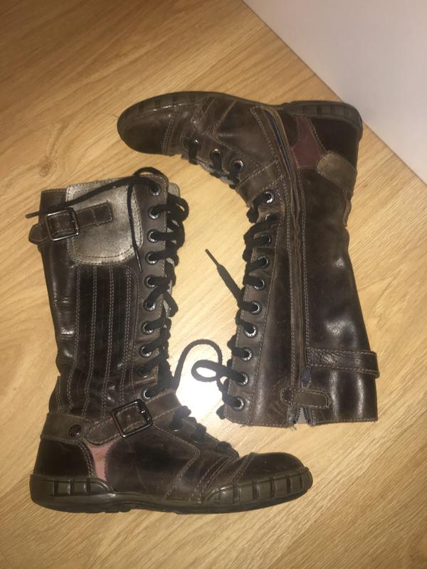 Очень качественные и стильные кожаные ботинки. Без дефектов! Покупались на стоке, очень жаль, но нам не подошёл размер. Кожа высокого качества, внутри стелька и боковушки все Кожа! Длина стельки 22 см. Высота сапога 28 см.