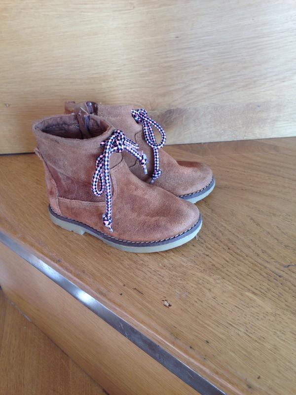 Продам круті черевички на дівчинку . Zara 23 р у відмінному стані. Натуральний замш. На замочок. Зверху декоративні шнурівки. На фото не передано реальний стан, бо падає тінь і виглядає нерівний колір, насправді колір рівномірний світло коричневий. Як на останньому фото. 15см