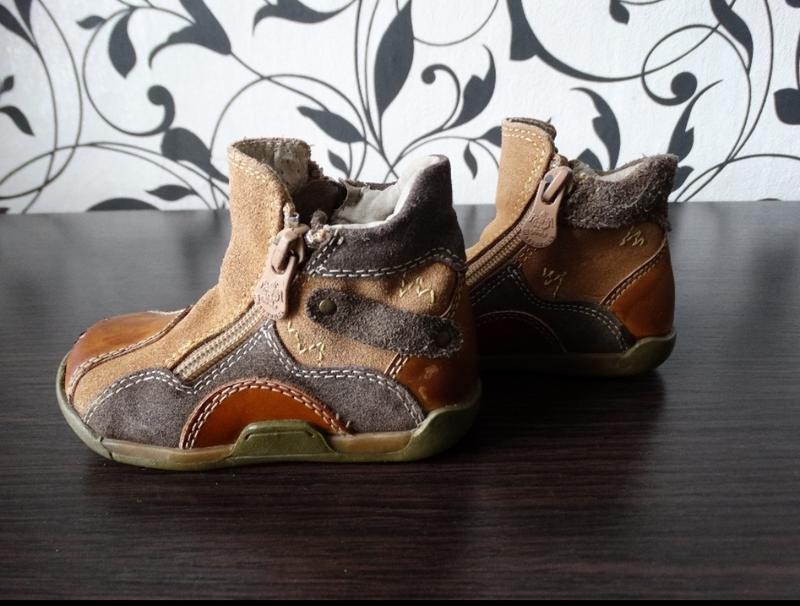 Ботинки из нат. кожи и замши. Производитель "Шалунишка". Стелька из супинатором, длина - 14,5 см. Общее состояние очень хорошее, за исключением передков ( потерто верхнее покрытие кожи). Их нужно покремить, я этого не делала, поэтому на фото выглядит броско. Внутри флисовая подкладка. Подойдут как девочке так и мальчику. На ноге сидят очень красиво и окуратно, не громоздкие.