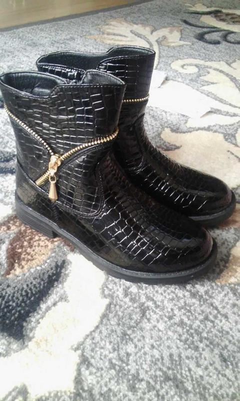 Детские демисезонные ботинки для девочки, верх - искусственная лаковая кожа, застегиваются сбоку на молнию. В наличии размеры: 34 р, - стелька 22 см
