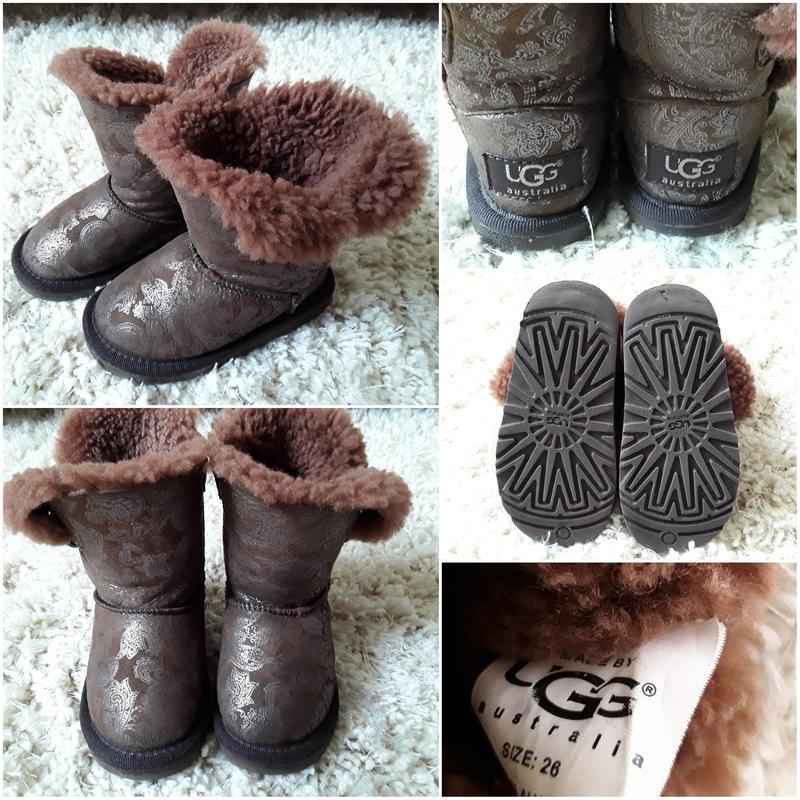 Теплющі угги для дівчинки з натуральноїшкіри. Всередині натуральна овеча вовна. Колір коричневий, узор перламутровим напиленням. Дуже класні!! Стан ідеальний, носики не стерті, задніки не затоптані. Розмір 26. По підошві 19см. Ідеально на ніжку 15-16см.