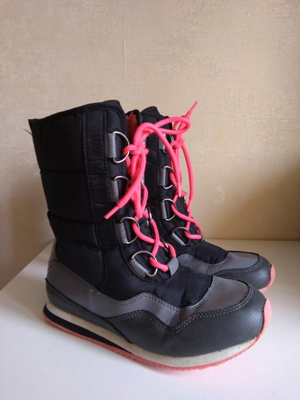 Высокие деми сапоги на шнурках. Внутри розовый флис. Голенище из плотной плащевки с утеплителем. Состояние очень хорошее, см.все фото, есть мелкие потертости. Стелька не вынимается, насколько смогла точно сантиметровой лентой измерила стельку 21-21.5 см. На ярлыке 35 размер и 220. Есть вопросы? Напишите мне!)