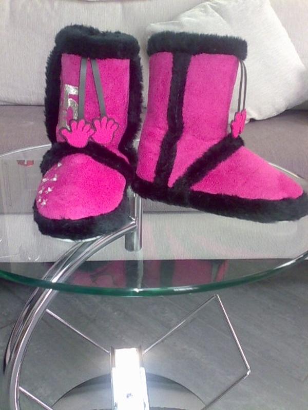 Смішні чобітки з штучних матеріалів.Не на лютий мороз і не на мокру сльота,але на суху прохолодну погоду затишно і комфортно.Гумова підошва,товстенький штучне хутро всередині.Так само відмінно для приміщення,якщо вдома чи в садку як на жаль часто буває,мало топлять.