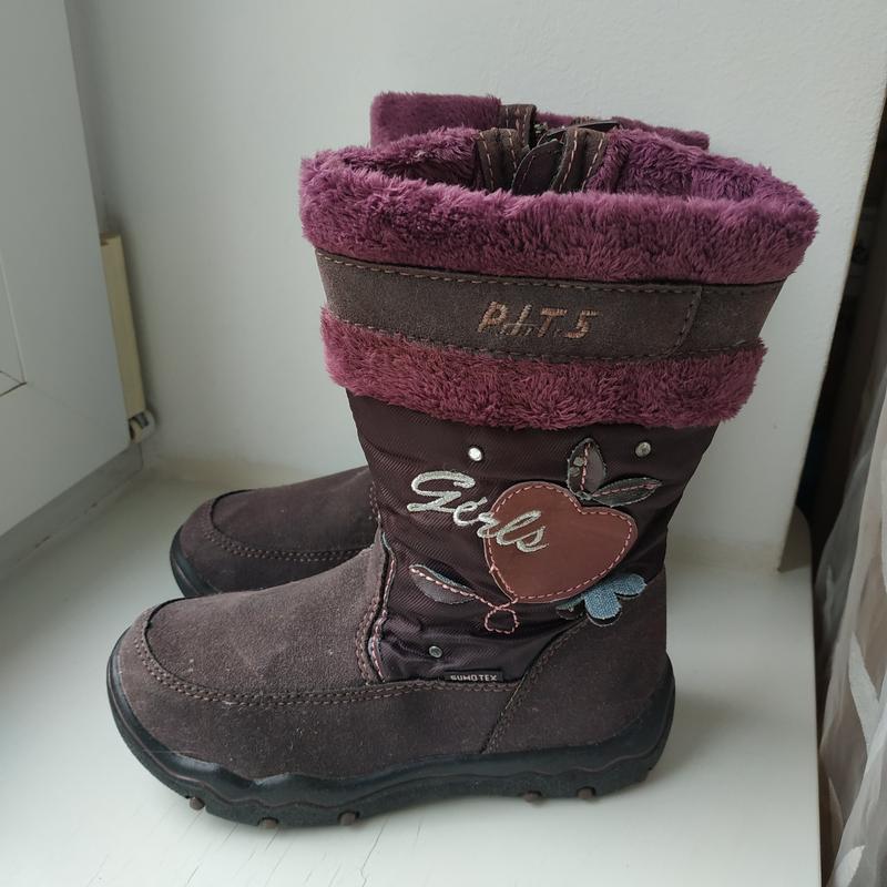 Зимние сапоги ботинки для девочки P.I.T.S Sumo Tex 28 размера, стелька 18.5 см. от края до края, замерялась вручную. Материал верха искусственный нубук. Молния ходит отлично. Чистые.