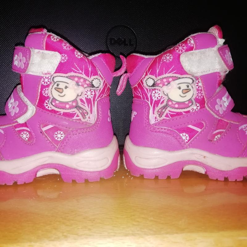 Классные ботинки с системой антискольжения, размер 22. Длина стельки есть на фото, листайте. Внутри овчинка, очень тёплые. Из нюансов, счесаны носки на носку никак не влияет. Носили один сезон, ноги всегда были тёплые и сухие.