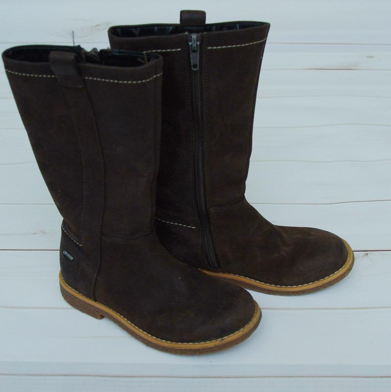 Сапоги из кожи. Очень комфорные. Внизу внутри предусмотрена вставка, чтоб не разошлась молния. Из недостатков: на самом замке краска стерлась (фото 2); пятка немного стерлась (фото 7) . во всем остальном состояние идеальное. довжина по устілці 18 см