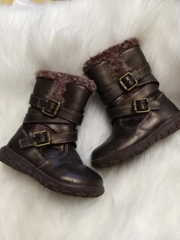 Симпатичные сапожки на девочку из кожзаменителя, утепленные флисом, застежка молния. Внутри и снаружи полный порядок, молнии рабочие, прочная подошва, не стерта, не продавливается. Мягкие и легкие, цвет коричневый металлик. Стелька 14 см. Высота 14 см. Китай. Арт. 0092