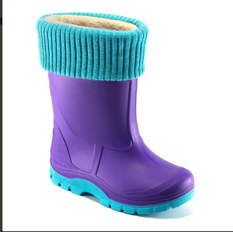 Дитячі гумові чоботи в фіолетовому кольорі. Також є у темно-синьому з сірим. Матеріал - ПВХ, зйомна вставка з флісу з відворотом в колір підошви, устілка. Чоботи м' які, легко взуваються. Розмір в наявності: 25/26 - 17,0см 27/28 - 18,0см 29/30 - 19,5см 31 /32 - 20,5см 33 /34 - 22,0см Матеріал якісний, без неприємного запаху. Фото з сайту та фото вживу.