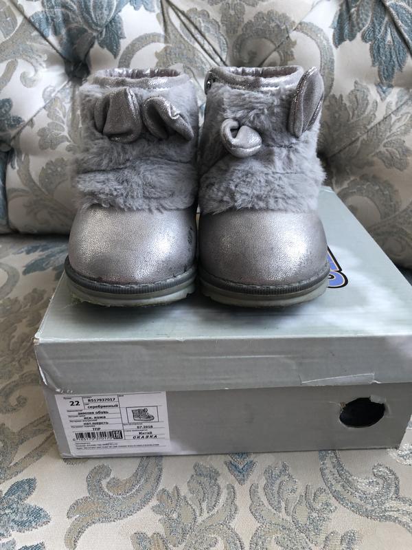 Серебристые угги с натуральной шерсти от фирмы Сказка. Дизайн с ушками, стильные и красивые. Внешний материал детских угг состоит из экологической кожи. Она прочная, надежная, не промокает, мягкая и стильно смотрится. Внутренний материал – натуральная шесть, теплая, удобная, прочная. Сбоку замочек. Подошва рифленая, устойчивая, морозостойкая, позволяющая преодолевать большие снежные сугробы. 22 размер-14,3 см Носили 2 месяца ,особо не топали ещё,сидели в коляске в топиках от комбинезона}