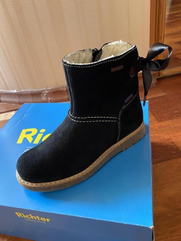 Richter - немецкий бренд качественной обуви. Натуральная замша, натуральный мех. Декорированы атласным бантиком. Длина стельки в 30 размере 19,5. Высота 13 см. Замочек застегивается очень легко. Товар новый!!! Не стоек!! Прямые поставки из Австрии. Все в оригинальной упаковке.