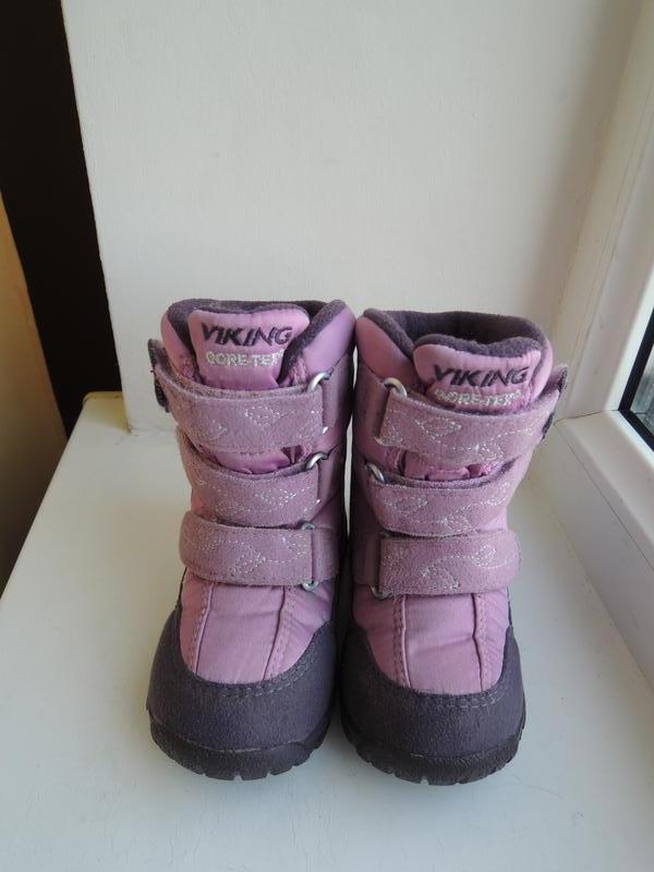 мембранные теплые зимние ботинки сапоги Viking Gore-tex (Норвегия), р.23. Длина стельки - 14 см. Общая высота -14 см. Цвет сиреневый. Полная защита от луж и слякоти. Синтетические материалы. Ботинки с хорошим слоем утеплителя, подойдут на морозы, на наши зимы. Состояние отличное, нюансов нет.