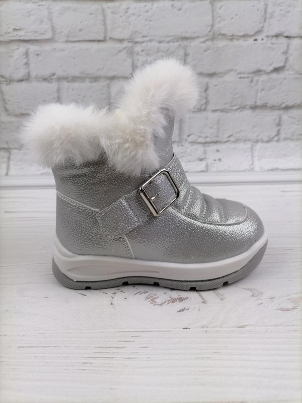 Сріблясті чобітки з білою опушкою на овчинці для малечі.Нова колекція. Легкі, модні, зручні. Збоку блискавка. Clibee. Розміри:22 (14см),23(14.5см),24(15см),25(16.0см),26(16. 5см),27(17 5см) Якість.Чудова ціна. Швидка доставка