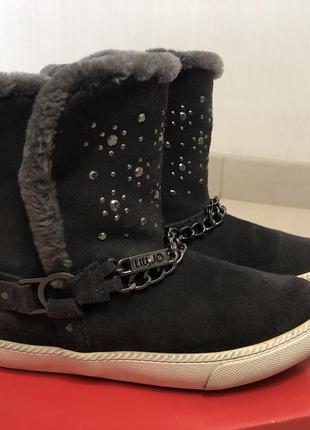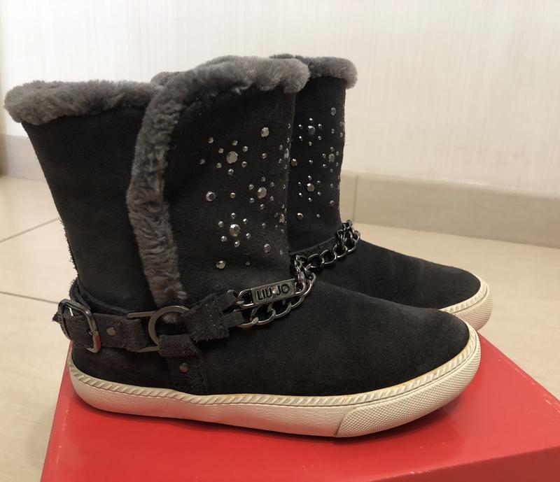Красивейшие, стильные ботинки Liu Jo.Оригинал. Цвет-темно-серый. До щиколотки утеплены искусственным мехом. От стельки до щиколотки тканевый подклад ( без утеплителя)с логотипом бренда.Стелька-кожа. Размер 31.Стелька-20 см. В отличном состоянии. Подойдут на ножку средней полноты с невысоким подъемом.