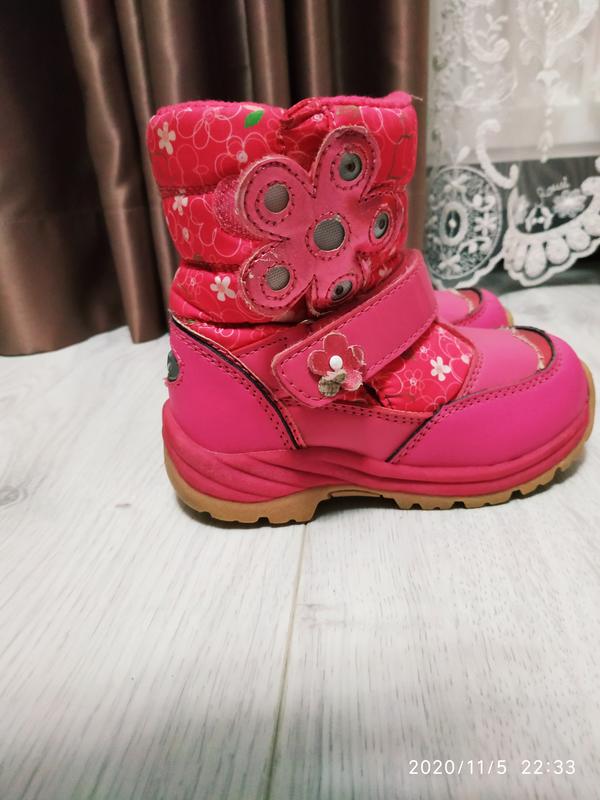 Термо ботинки для девочки фирмы BG Termo, очень теплые и непромокаемые. Размер указан 27, стелька не вынимается, я вымеряла 16 см. Цветочки-липучки мегают. Состояние очень хорошее, целые полностью!
