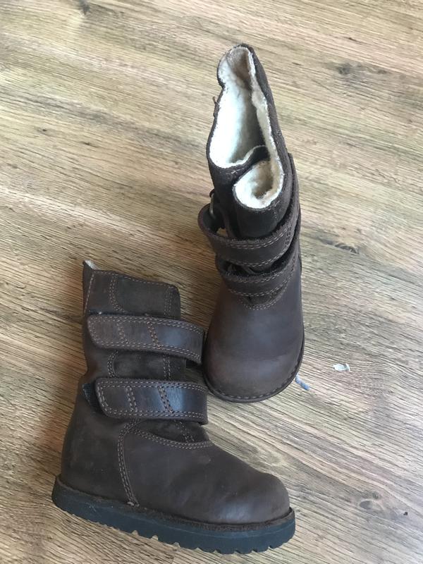 Коричневые сапожки, утеплённые. Указанный размер 24. Длина стельки 15,5см. Застёгиваются на две липучки.