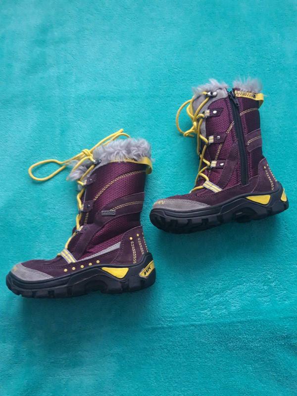 Зимние сапоги на девочку фирмы Bartek. Цвет бордо с яркими шнурками. Очень тёплые. Длинна по стельке 16,5см., высота 19 см. Обуты один раз, переросли.