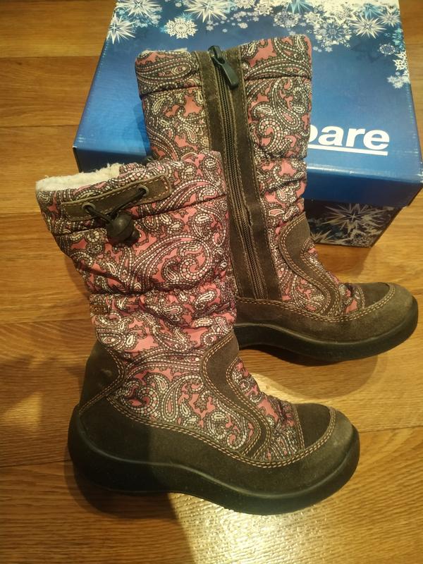 теплые, качественные сапожки, нога в них не потеет, не мокреет, размер 31, носили один сезон, покупали за 1387 грн.,есть маленький, но легко устранимые дефект, на фото видно, на застежку не влияет, нужно подклееть в мастерской