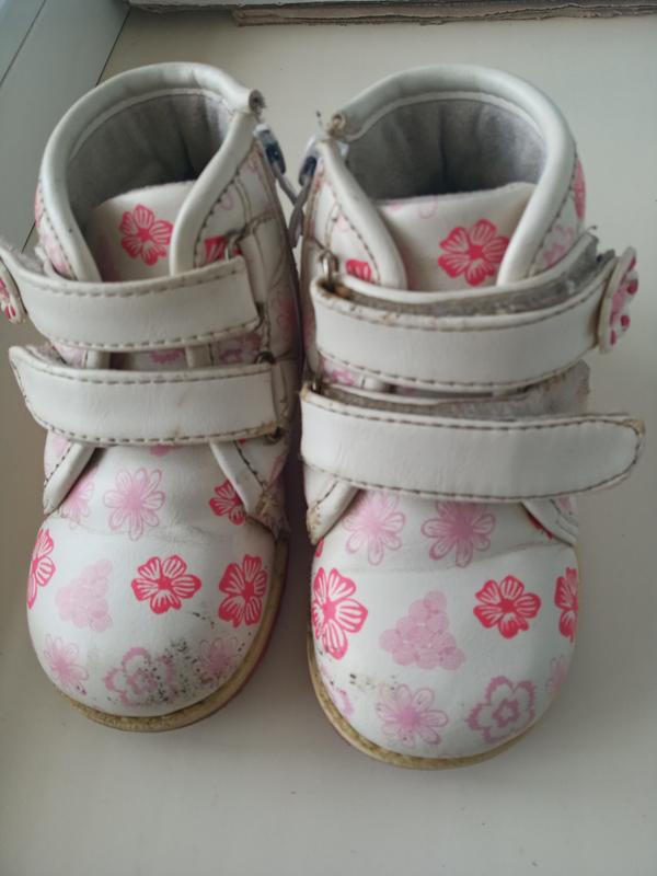 Ботиночки для девочки в миленькой расцветке. Змейки в порядке, липучки тоже. Удобно обувать. Счесаны носки, не критично и со внутренней стороны, там где змейка. В целом состояние нормальное. Стелька 14см.