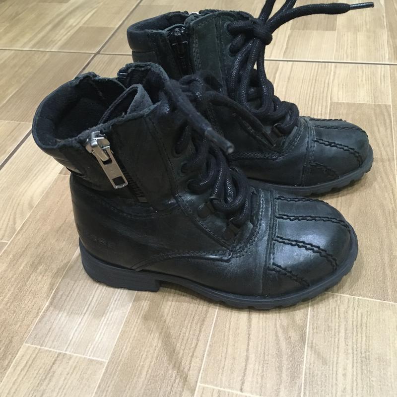 Ботинки в отличном состоянии, подойдут как девочке, так и мальчику.Натуральная кожа снаружи, внутри натуральная замша, подошва резина. Размер 7,т.е.23. 16,5 см стелька. Цвет черный с белым напылением, очень стильные!