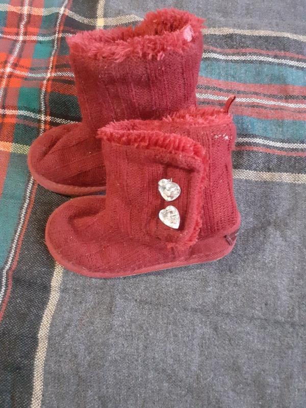 Угги красивого вишневого цвета на искуственном меху по бокам красивые пуговички- сердечки в хорошем состоянии)