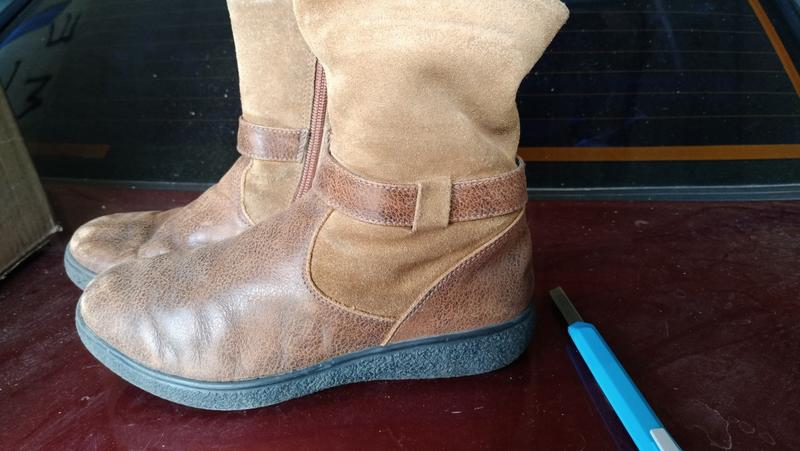 Кожаные сапожки р.35, для девочки, коричневые состоят из двух видов кожи, глянцевой и матовой. Состояние хорошее.
