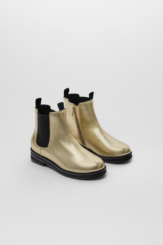 Золотистые ботинки, нарядные сапоги челси, сапожки, золотисті черевики черевички, чобітки челсі, zara Золоті черевички челсі від Zara. Замовлено з офіційного сайту. По боках контрастні еластичні вставки та контрастна підошва. Підкладка в середині - 100% бавовна. В наявності Розмір 34 Вказана стелька - 21,6 см Розмір 35 Вказана стелька - 22,3 см Заміри співпадають.