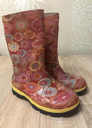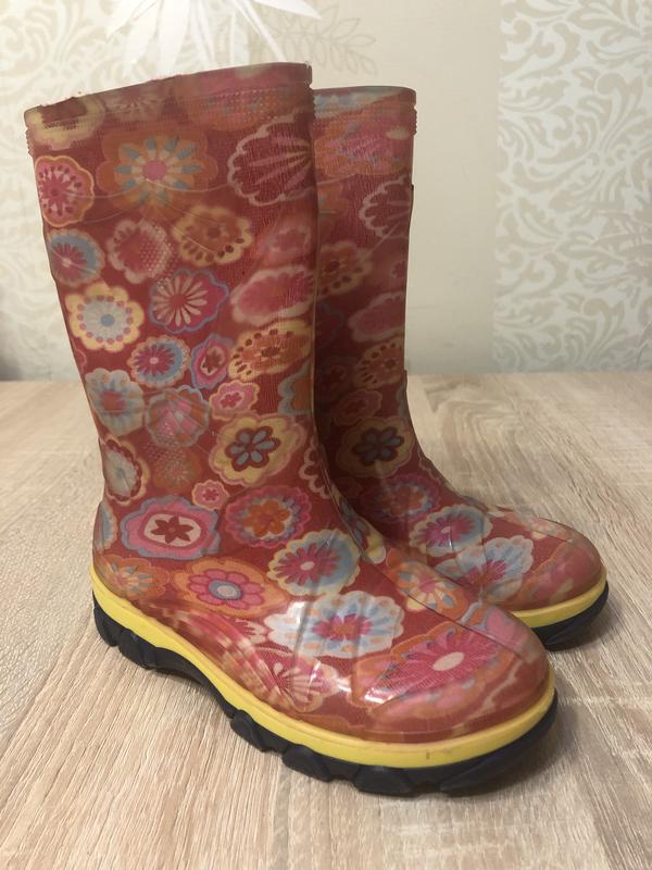 Гумові чобітки 28 розміру квіткового принту. На підошві є цифра 180, думаю на ніжку 18 см.