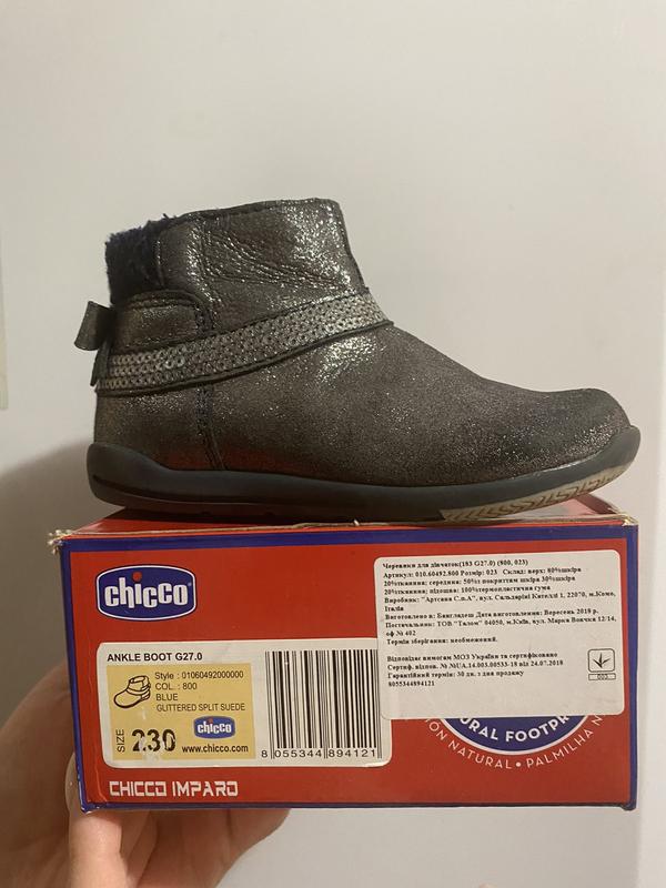 Шикарные ботинке chicco на девочку, размер 23. Натуральная кожа (80%). Цвет сине-серебристый (больше серебристый). Выглядят очень стильно. В носке были 1 осень.