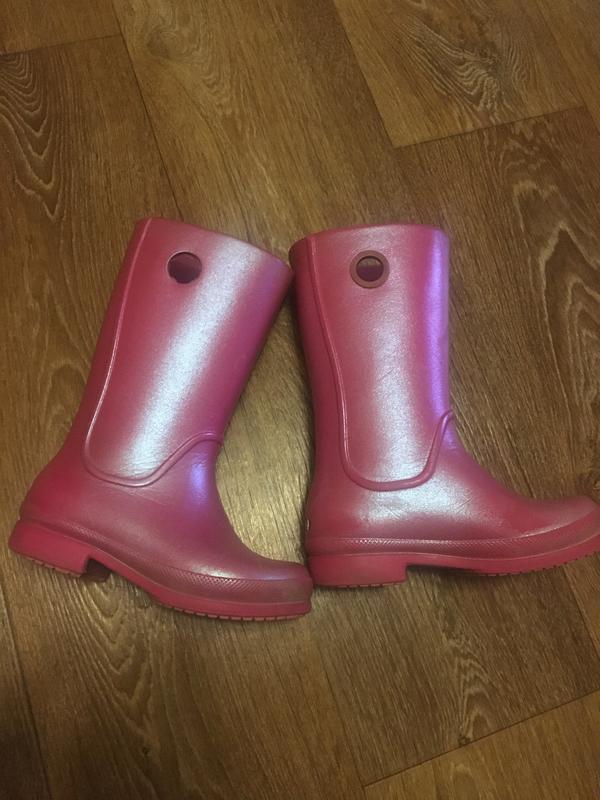 Резиновые сапоги девочке crocs. Состояние очень хорошее. Единственное на одном сапоге нету кругленьких штучек(фото) можно снять с другого, можно один переставить