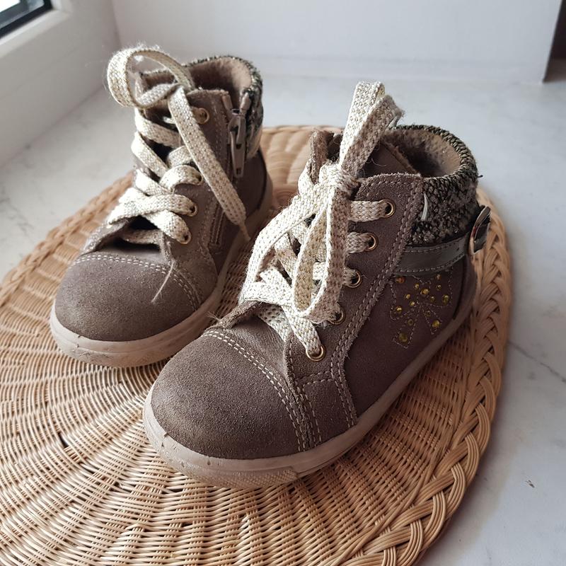 Модні замшеві черевички для дівчинки. З лаконваною смужкою та стразами, утеплені. Стан дуже хороший, розмір 24.