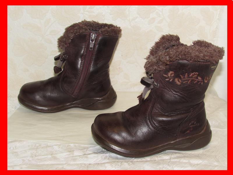 Сапожки Clarks - СУПЕР !!! Указан размер 5,5 G. Длина стельки 14 см. Высота сапога без подошвы 10 см, Ширина голенища примерно 19 см. Отличное состояние!!! Верх натуральная кожа , внутри по сапожку утепление тонкий поролон, стелька натуральная кожа . Застёгиваются на молнию . Прочная подошва.