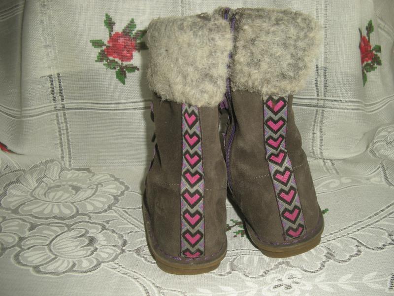 П\сапоги для девочки на тонкой,серого цвета из исскуственного меха,такие-же отвороты,застегиваются изнутри на фиолетового цвета замок-молнию,надежная литая,прошитая подошва.
