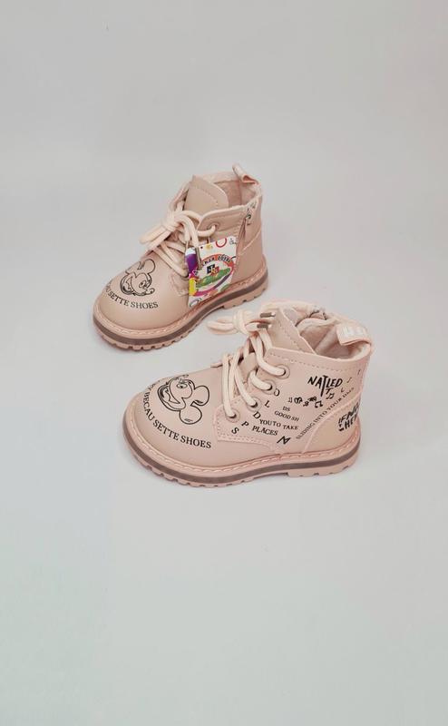 Топові черевики в пудровом кольорі! Підошва світиться під час ходьби. Всередині утеплені плюшем, шкіряна устілка з супінатором. Є блискавка та шнуровка! Розміри: 22--14 см 23--14,5 см 24--15 см 25--15,5 см