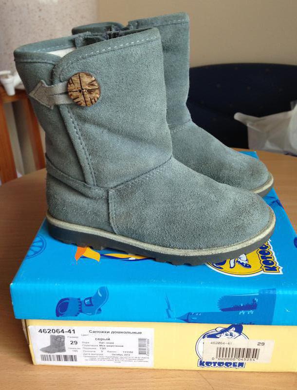 Продаю зимние теплющие спожки ТМ"Котофей", р. 29 (17 см по стельке). Специально искала именно эту модельку (по типу угг) по рекомендации своей подруги и не пожалела! Сапожки - супер: удобные, теплые, красивые, не скользят. Верх сапожек выполнен из натруальной кожи (замша серого цвета), внутри - натуральная овчина (не искусственный мех!), стелька - натуральный войлок. Моя доця носила в -20С только на обычные колготки. Ножке тепло, но, при этом, она не потеет. Состояние отличное (см.фото в подтвержение). Девочки, обратите внимание, что длина стельки у сапожек Котофей (так же и у их валенок) в 29 размере = 17 см, а не 18 см, как указывают многие продавцы, стельку перемеряла лично. Подойдут в равной степени мальчику и девочке.