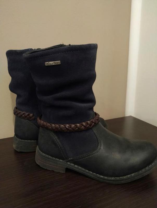 Натуральна шкіра+замша. Всередині - утеплювач. Демісезон, холодна зима. Розмір устілки 18,5-18,8 см. Висота черевика - 18,5 см (від підлоги), 16 см - від п'яти. Колір - темно-синій (майже чорний).