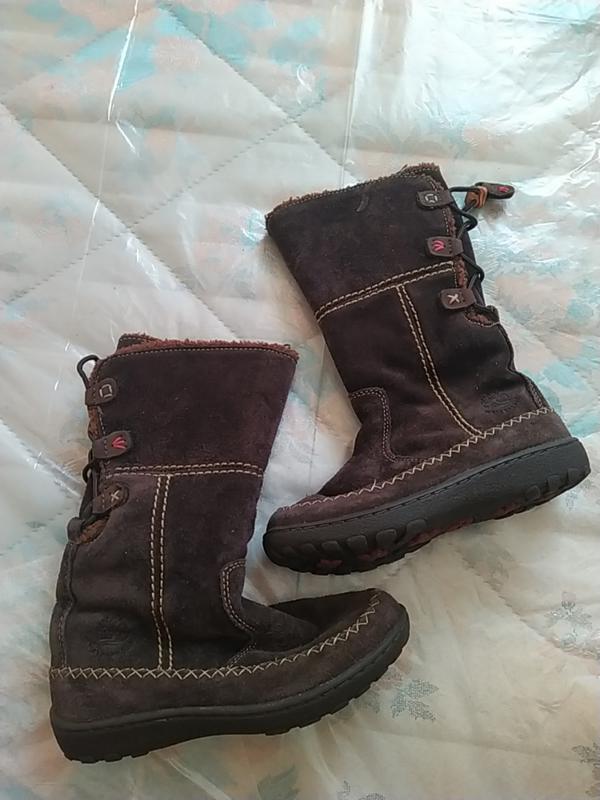Замшеві чобітки TIMBERLAND розм 31 устілка 19см В дуже хорошому стані зручні чобітки на дівчинку. По устілці 19 див. Натуральний замш зовні і всередині вовна. Ззаду декоративні зав'язки, якими можна підтягнути халяву. Поліуретанова прошита підошва. Можна ходити весна-осінь-маломорозная зима.